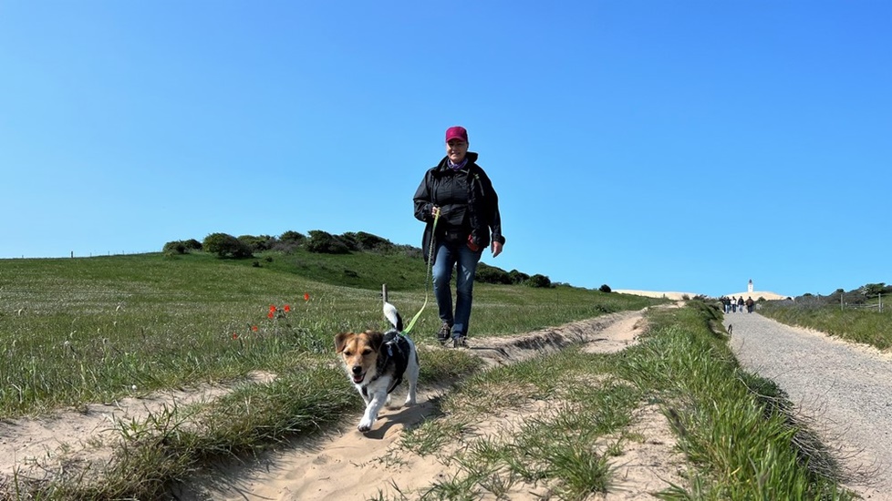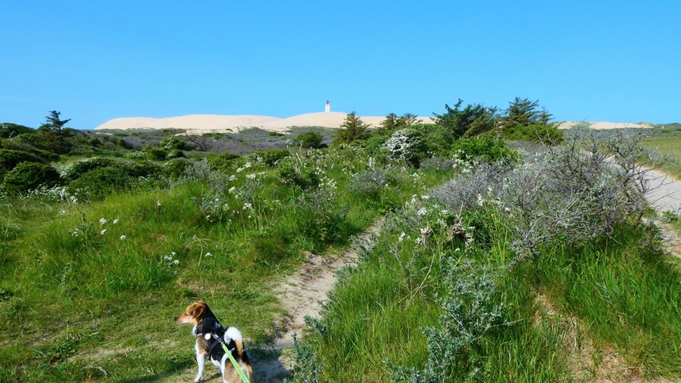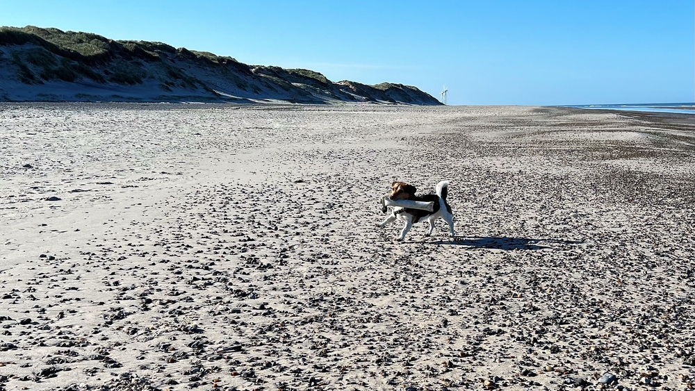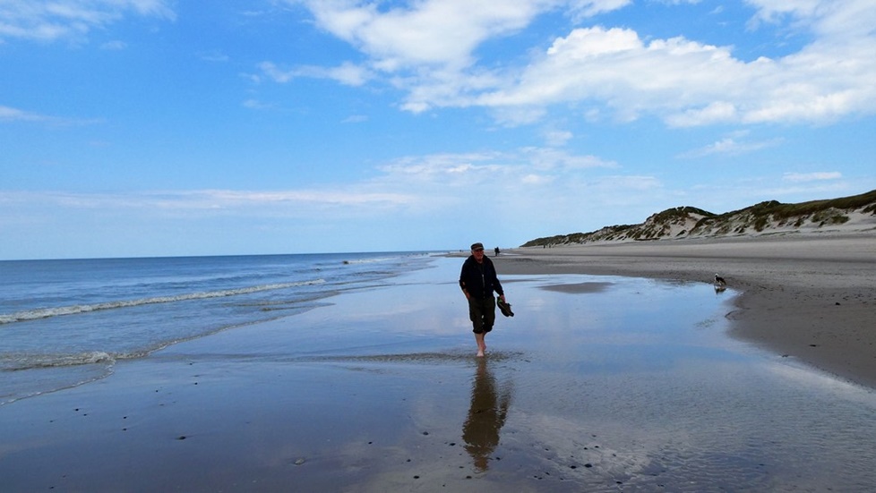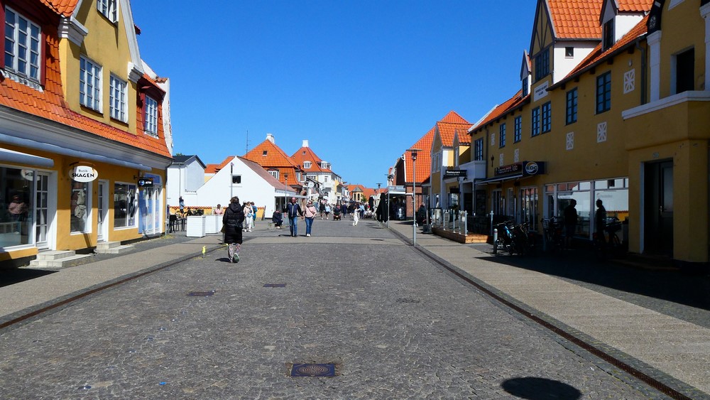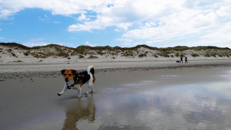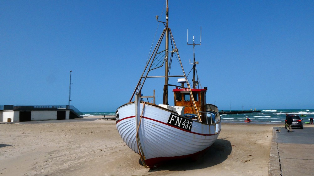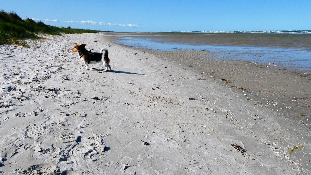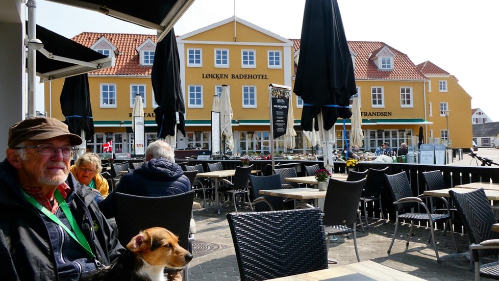 Momo kann auf dem wasserlosen Strand rennen und semelen wie eine Wespe - dann wieder ab ins Körbchen und über holprige Wege durch die Dünen zum Hafen. Dort erkunden wir den Hauptort von Römö = Havneby. Es ist ganz lauschig hier. Dicke Jacken und Mäntel werden hier feilgehalten - und werden bei diesem windigen Wetter sicher gut verkauft (grins). Wir kosten in einer Fischbude eine gebackene frische Scholle und ein dänisches Bierli - lecker.