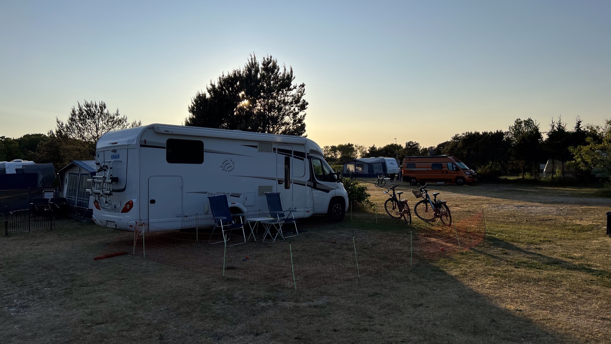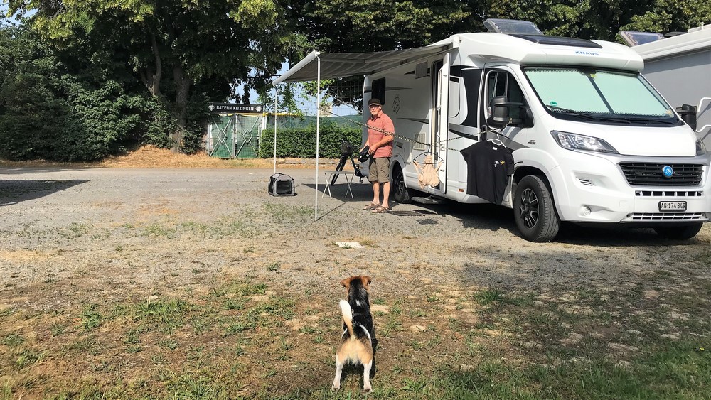 Wir radeln retour und unterdessen, es ist ja Vor-Auffahrtstag, ist der riesige Stellplatz doch tatsächlich ganz besetzt. Unglaublich. Zum grössten Teil sind es deutsche Camper, die hier stehen. (Und natürlich ein Schweizer und das sind wir, hihiiii).