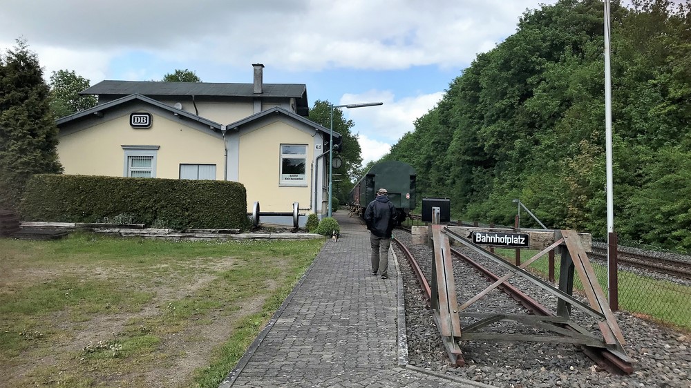 Nach 2 Stunden Fahrzeit suchen wir über Google Maps einen geeigneten Ort für eine Mittagsrast. Wir landen in Kleinkummerfeld auf einem Bahnhofareal an der ursprünglichen Bahnstrecke zwischen Neumünster und Bad Segeberg. Diese Strecke wurde 1875 in Betrieb genommen. Der Bahnhof ist heute im Besitz eines Eisenbahnfreunde-Vereins.