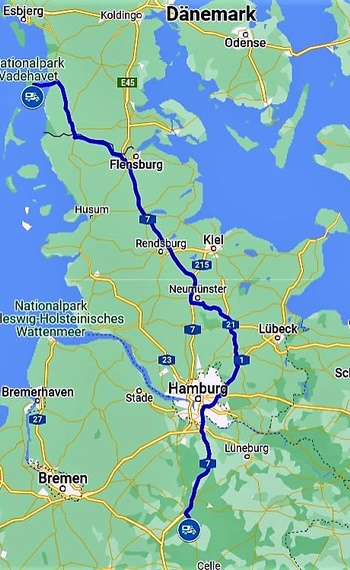 Über die A7 geht es in Richtung Hamburg. Wir wählen dann eine Alternativ-Route und umfahren Hamburg grossräumig. Trotz einiger Baustellen und vieler Lkw’s kommen wir ohne Staus zügig voran.